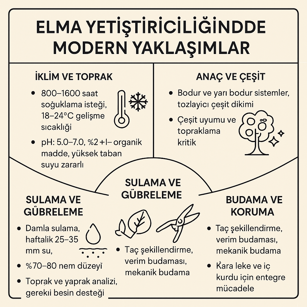 Sonuç: Elma yetiştiriciliği klasik yöntemlerden ziyade modern sulama, gübreleme ve yoğun dikim sistemleriyle daha verimli hale gelmektedir. Sensör destekli teknolojiler gelecekte standart uygulama olacaktır.